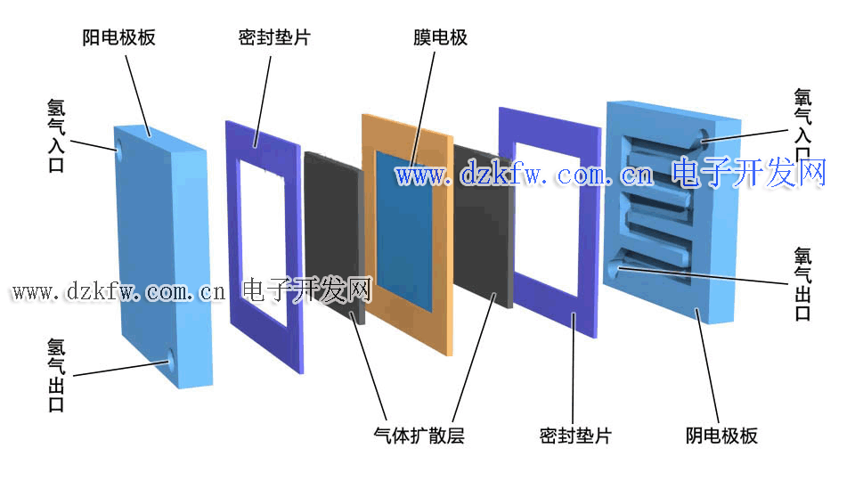 電極板    單個電池有兩個電極板,陽極板與陰極板。除了收集電子,陽極板提供輸入氫氣的通道,陰極板提供輸入氧氣的通道。在極板上開有槽,稱為流道。流道引導反應氣體流動方向,確保反應氣體均勻分配到電極的各處。流道兩端有氣體入口與氣體出口,