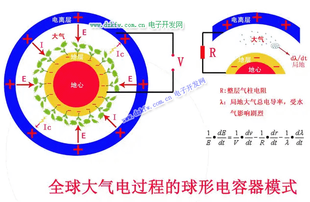根據(jù)大氣電現(xiàn)象的研究表明,從靜電角度來(lái)看,地球和大氣近似形成一個(gè)漏電的球狀電容器,如圖1、2所示,其中地球表面帶負(fù)電,大氣帶正電,距地表50公里高度以上的大氣由于電離程度很高,可認(rèn)為是一個(gè)理想導(dǎo)體。由大氣電測(cè)量表明:接近地球表面的電場(chǎng)是垂直指向地球表面,在晴天情況下,其數(shù)值約為 E0(r0)=100伏/米,而地球表面上的電荷密度-8.85×10-10庫(kù)侖/米2,地球表面上攜帶總負(fù)電荷量為4.51×105(庫(kù)侖),大氣的電流密度約為-3×10-12(安/米)2。