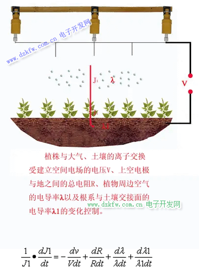 圖式中,v、r、γ、γ1分別為布設(shè)在植物上方的電極線與地之間的電位差以及其間的氣柱電阻、總電導(dǎo)率和植物生活體系總電導(dǎo)率。表明植株體內(nèi)離子響應(yīng)電流的大小由空間氣體的電學(xué)參數(shù)及栽培基質(zhì)、植株體本身的電學(xué)參數(shù)的變化決定,也就是環(huán)境中任一因子的變化都會(huì)影響植株體內(nèi)離子肥料的濃度和分布。因此,特殊變化的空間電場(chǎng)及作用于該空間電場(chǎng)中的環(huán)境因子的變化均可改變植株吸收離子養(yǎng)料和同化物的運(yùn)輸狀態(tài)。