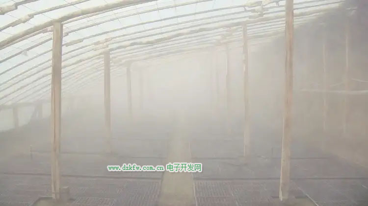 空間電場(chǎng)發(fā)生系統(tǒng)啟動(dòng)15分鐘后的現(xiàn)場(chǎng):溫室電除霧防病促生系統(tǒng)空氣除霧聚水效果