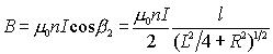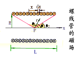 任取電流元 ,由畢-薩定律得: ,方向如圖:將dB進(jìn)行正交分解: 所以有: 所以: 所以: ,方向:沿x軸正方向,與電流成右螺旋關(guān)系。討論:(1)圓心處的磁場:x=0 , (2)當(dāng) 即P點(diǎn)遠(yuǎn)離圓環(huán)電流時(shí),P點(diǎn)的磁感應(yīng)強(qiáng)度為: 例3:設(shè)有一密繞直螺線管。半徑為 R ,通電流 I。總長度L,總匝數(shù)N(單位長度繞有n 匝線圈),試求管內(nèi)部軸線上一點(diǎn) P 處的磁感應(yīng)強(qiáng)度。 |