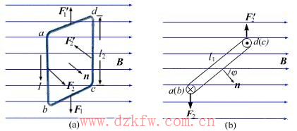 對(duì)于導(dǎo)線ad段和bc段,作用力的大小相等、方向相反,并且在同一直線上,所以它們的合力及合力矩都為零。而導(dǎo)線ab段和cd段所受磁場(chǎng)作用力的大小則分別為: