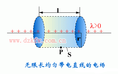 例2:均勻帶正電無限長細棒的場強.其線電荷密度為 . |