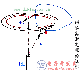 根據磁場疊加原理,任意載流回路產生的總磁場B是各電流元產生的元磁場dB的矢量和, 從而通過某一面元dS的總磁通量是各電流元產生元磁通的代數和。至此,磁場的"高斯定理"得到了完全證明。