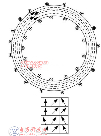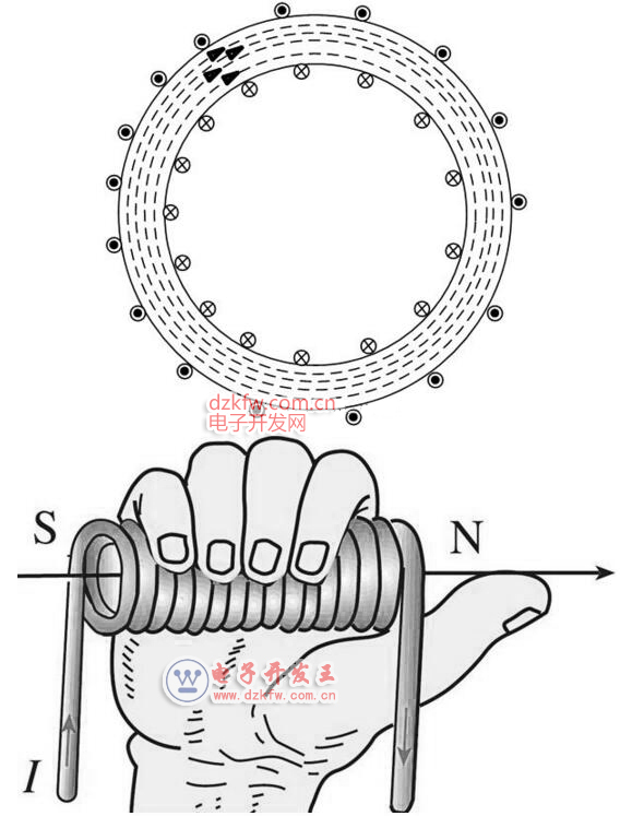 再次強調一下,我們之前提到的"規則磁"概念,開關電源無論變壓器或者電感,磁路都是被磁性材料限制的一個閉合回路,以鐵磁性材料做成的電感說明,磁通或磁力線被限制在低磁阻的磁芯中,這為我們用法拉第定律或安培環路定理的計算提供了諸多便利(前幾節我們推導電感公式和氣隙均用到安培環路定理),如下圖是環形電感中磁力線(虛線)在磁芯中分布的示意圖,其中圓圈"X"表示電流流進線圈,圓圈"·"表示電流流出線圈,磁力線方向用右手螺旋定則可以判斷。
