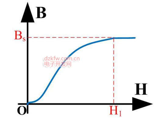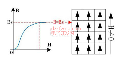 隨著外加磁場H的進一步加強,鐵磁材料的磁疇方向和外加磁場外加完全一致,鐵磁材料達到最大磁通,出現"極限磁化"即磁芯飽和,這時候外加磁場進一步加強,但鐵磁材料的磁通不會再增加,磁通密度達到最大值Bs。