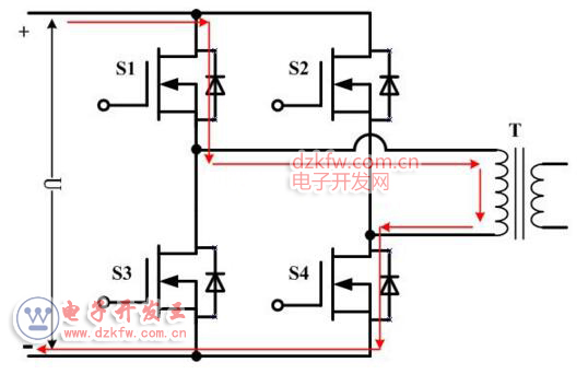 飽和舉例:如下圖是全橋拓撲,如"紅線"路徑,假如變壓器飽和,那么母線"U"就會被短路,這時候如果沒有保護措施或者保護響應時間不夠,包括電路中的功率開關管、變壓器線圈等會一并燒毀。