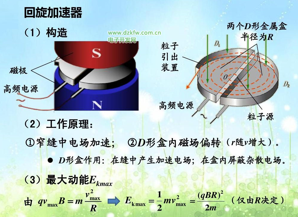 30年代,隨著勞倫斯回旋加速器的發(fā)明,各種加速器相繼出現(xiàn)。但產(chǎn)生高能粒子最理想的加速器是回旋加速器,這種加速器使帶電粒子的運動軌道呈圓形,所以叫圓形加速器,回旋加速器是圓形加速器的一種。當時這種加速器的直徑不足1/3米,能把質(zhì)子加速到125萬電子伏。1939年美國加利福尼亞大學回旋加速器直徑已超過1.5米,具有2000萬電子伏的能量。電子回旋加速器的原理,是用交變電場將帶電粒子約束在一定的磁場范圍內(nèi),隨著粒子能量的提高,所繞圈子的半徑越趨增大,要約束它不致逃逸出6米直徑的范圍就需要7200噸重的實心磁鐵。如果提高能量10倍,就要增加磁鐵1000倍,可見此法是很不經(jīng)濟的。為了減輕重量,科學家又研制出新的加速器。1945年蘇聯(lián)和美國物理學家分別研制成同步回旋加速器,解決了加速器內(nèi)粒子質(zhì)量隨著速度的增加而增大與電磁場作用不協(xié)調(diào)之間的矛盾,使粒子研究不斷取得新成果。