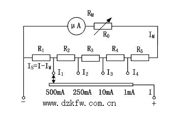 應用最多的是閉路抽頭式分流電路,其電路如圖1所示。圖中R1~R5統稱為總分流電阻RS,實際產品中,為了便于調整和成批生產,總分流電阻RS大多采用較大的整數千歐的阻值,表頭上再串聯一只可變線繞電阻R0,當表頭參數有變化時仍可以得到補償并方便調整。
