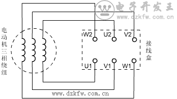 三相異步電動機的三相定子繞組每相繞組都有兩個引出線頭,總共六個引出線頭,分別以U1、U2;V1、V2;W1、W2表示。這六個引出線頭引入電機接線盒的接線柱上,見圖一。