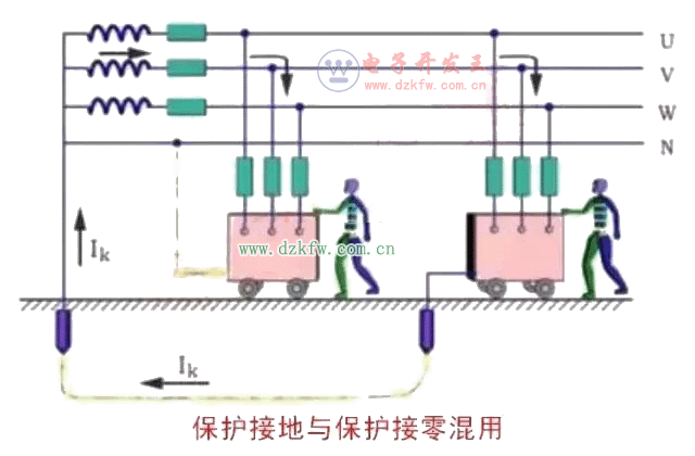 (3)線路結構不同。如果采取保護接地措施,電網中可以無工作零線,只設保護接地線;如果采取了保護接零措施,則必須設工作零線,利用工作零線作接零保護。保護接零線不應接開關、熔斷器,當在工作零線上裝設熔斷器等開斷電器時,還必須另裝保護接地線或接零線。