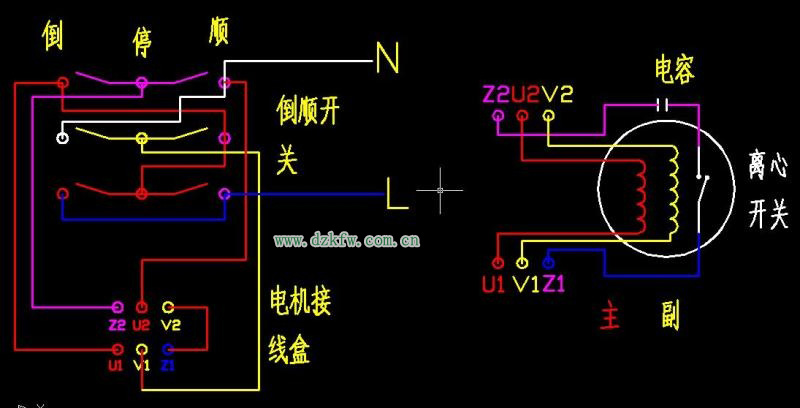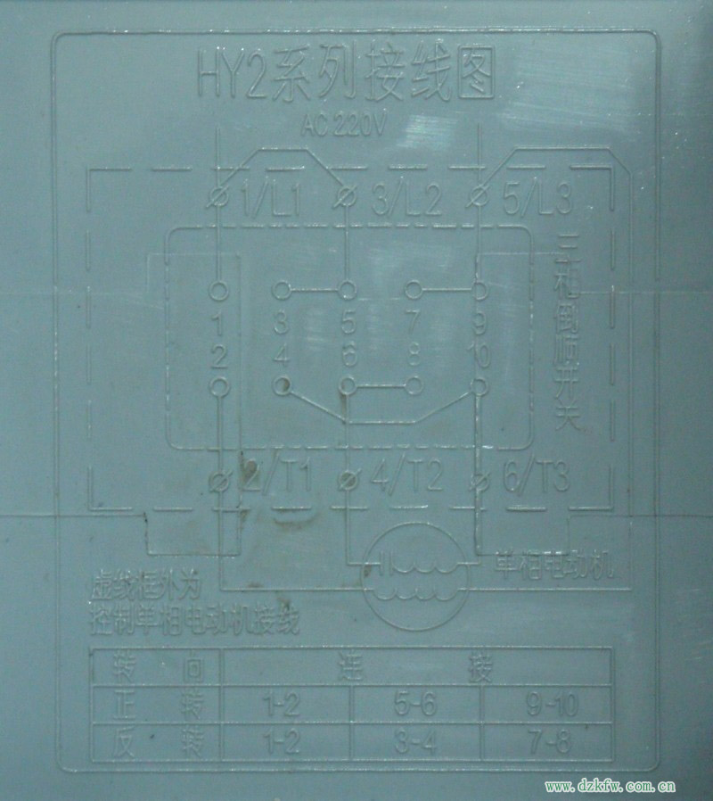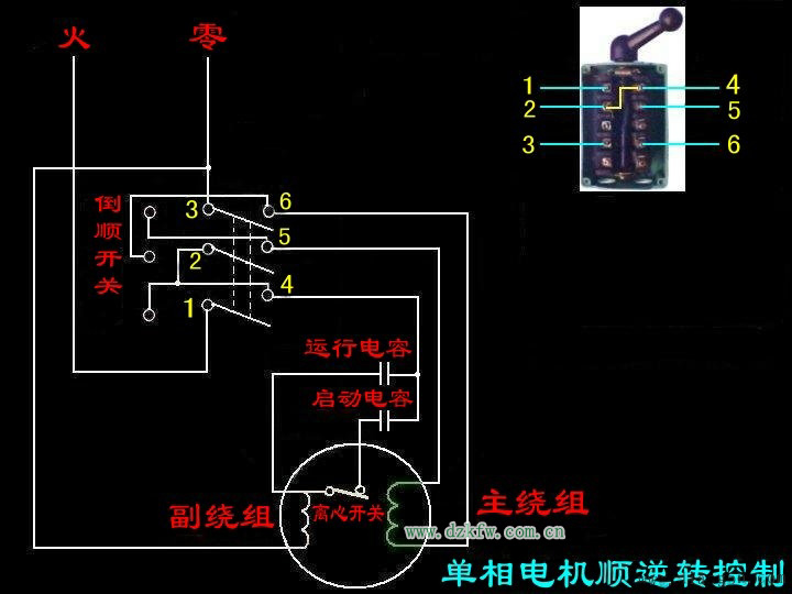 注明:此圖是簡單式接線方法,上面的9個圓點的是倒順開關,接線時開關柄朝上。下面6個圓點的是電機,電機轉軸方向向左。一般電機接好后試機,倒順兩個方向都要試一下,如電機有異樣應注意隨時拔掉插頭。另外:注意安全!