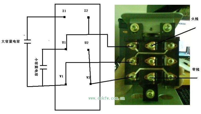 情況二:沒有被小鐵連接的接線端在風扇方向這邊,請按《電機二情況》這種接線方法接線。在接線時,電機接線端的小鐵片需要去掉。