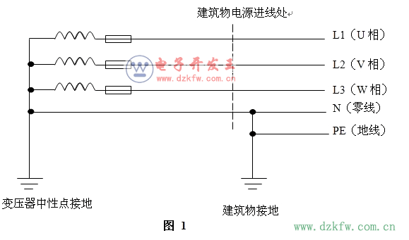 在TN-S供電系統中,一般情況下居民用電負載是不會相同的,即三相負載不平衡,三相變壓器一般采用Y-YN0接線,變壓器的三相繞組的中性點接在一起,并且接地,(如圖1所示)這條線引出來就是零線(N),零線的干線部分也叫中線,中線保證了三相不平衡負載每一相的電壓相等,都等于220V,故中線上不許安裝保險絲或開關。這三相四線(U、V、W、N)從配電房來到民用建筑。每一幢建筑物正常的情況下都要有符合國家技術標準的接地裝置,從接地裝置拉出來的線就是地線(PE)。一般在建筑物的一樓,地線和從配電房過來的零線,將會連接在一起,這樣做的目的是讓中線(零線的干線部分)重復接地,提高系統的接零保護水平,減輕故障時的觸電危險。按國家標準要