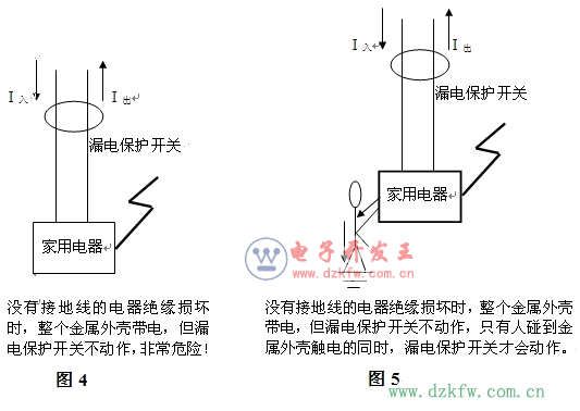等于I出,所以漏電保護開關不會動作(如圖2)。如果電飯鍋絕緣出問題的時候,火線碰到了外殼,而電飯鍋的外殼是接有地線的,有一部分漏電電流通過地線流入大地,這部分電流通過大地回到變壓器中性點形成回路。這樣對于漏電保護開關來講,流入的電流肯定和流出的電流不相等,因為有一部分電流經過地線流入大地了,所以漏電保護開關馬上就會動作,使人體避免了觸電的危險(圖3)。如果家里沒有安裝地線,當平時家用電器絕緣良好的情況下,倒是太平無事,當電器的絕緣出問題的時候,電飯鍋整個外殼帶電,但是由于外殼沒有接地線,不可能和變壓器中性點形成回路,也就不可能形成漏電電流,此時對于漏電保護開關來說,I入還是等于I出,所以漏電保護開關對電飯鍋外殼帶電渾然不知,此時漏電保護開器在電器外殼帶電的情況下也不會跳閘。當人體接觸到電飯鍋外殼時,如圖4所示,就有電流通過人體流入大地,回到變壓器中性點形成回路,此時,流入漏電保護開關的電流和流出漏電保護開關的電流就不相等(因為有一部分電流通過人體流入大地去了),漏電保護開關將會在0.1秒之內動作。雖然動作后,人就沒有危險了,但缺少地線終歸對人體是不安全的。(漏電保護開關動作時人已經觸電,雖然不至于喪命,但對人體是有傷害的)所以說如果在居民住宅區不安裝地線,當設備漏電時,漏電保護開關將不會動作,人將會有觸電的危險。