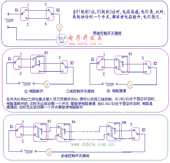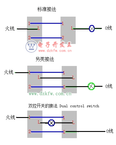 就一種,單聯雙控開關有三個接線端口,分別是上L1、中L、下L2,用兩個單聯雙控開關就可以在不同的地方控制一個燈,接線方法:火線進任意一個單聯雙控開關的中L端,再把兩個開關的上L1與上L1端口相連,下L2與下L2端口相連,然后再由另一個單聯雙控的中L端出一根控制線到燈頭,就可以了.