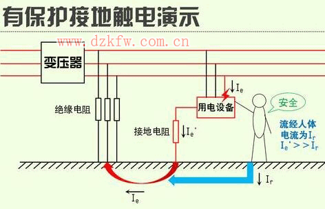 (1)保護接地:電氣設備的導體部分或者外殼用足夠容量的金屬導線或導體可靠的與大地連接,當人體觸及帶電外殼時,人體相當于接地電阻的一條并聯支路,由于人體電阻遠遠大于接地電阻,所以通過人體的電流將會很小,避免了人身觸電事故。