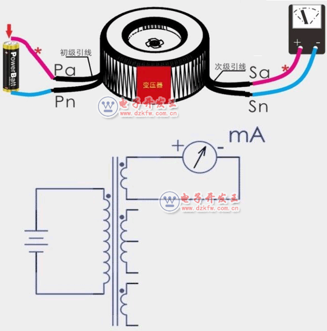 如果什么標(biāo)記都沒(méi)有了,可以自行判斷,現(xiàn)場(chǎng)老工人經(jīng)常說(shuō)的“花進(jìn)花出”的意思是初級(jí)側(cè)電流從某端流進(jìn),次級(jí)側(cè)電流就從同極性端流出。所以你用1.5V電池的負(fù) 極接至初級(jí)側(cè)的Pn端,次級(jí)側(cè)萬(wàn)用表直流電壓檔(或毫安檔)的正端接于變壓器Sa端,表的負(fù)端接于Sn端,當(dāng)電池的正極接通變壓器初級(jí)側(cè)Sa端的一瞬間,表計(jì)指針應(yīng)該正方向擺動(dòng)(即電流從Sa經(jīng)過(guò)萬(wàn)用表流向Sn),那么就說(shuō)明Pa和Sa是同極性端。因?yàn)闃O性端在圖紙上都用星花“*”表示,所以為了好記就有“花進(jìn)花出”一說(shuō)。如果碰到變壓器有多組電壓的,也是一樣的判斷方法。根據(jù)測(cè)試的結(jié)果將同名端一一標(biāo)記,即可得到想要的結(jié)果。