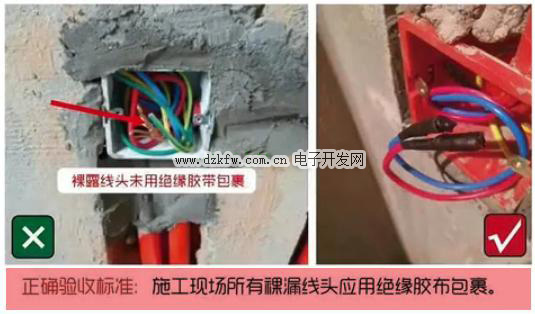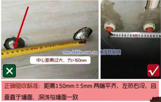 水電改造水路的冷熱出水口按照左熱右冷來施工,冷水和熱水出水口之間相距150mm左右。保證冷熱出水口在同一平行線上,與墻面垂直。