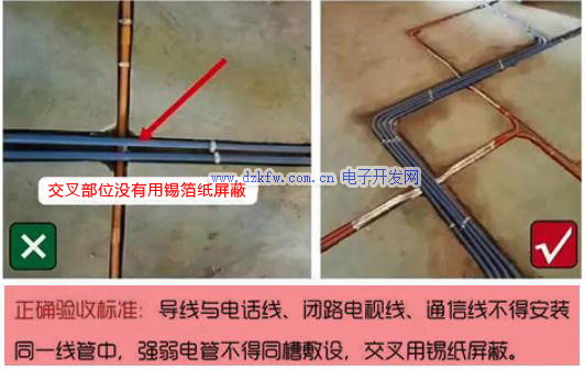 強電個弱電線管不能同槽鋪設。當電路鋪設過程中,強電和弱電線管發生交匯時,需要裹上一層錫紙進行隔離,避免強電和弱電電流造成干擾。
