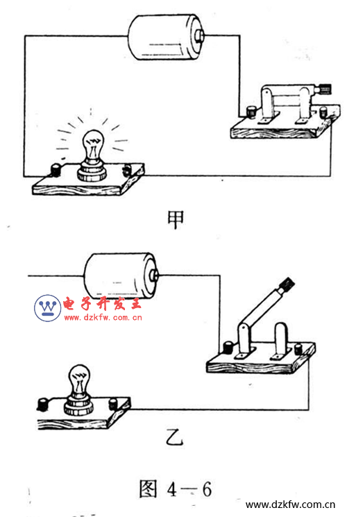 實驗照圖4-6那樣,把小燈泡與干電池連接起來,合上開關,小燈泡就持續(xù)發(fā)光(圖甲);打開開關,小燈泡就熄滅了(圖乙)。