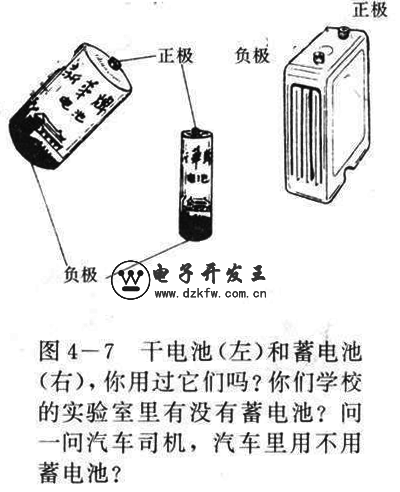 小燈泡持續(xù)發(fā)光,表示有持續(xù)電流通過小燈泡的燈。絲。這個持續(xù)電流是由于電池是由于電池提供的,像干電池這樣能夠提供持續(xù)電流的裝置,叫做電源。干電池是電源,實驗室里用的蓄電化也是電源(圖4-7)。電源有兩個極,一個正極,一個負極。電源的作用是在電源內(nèi)部不斷地使正極聚集正電荷,以持續(xù)對外供電。摩擦起電是用摩擦的方法,使正負電荷分開的。干電池和蓄電池是用化學的方法,使正負電荷分開的,從能量轉化的觀點來看,電源是把其他形式的能量轉化為電能的裝置,干電池、蓄電池對外供電時,電池內(nèi)部發(fā)生化學變化,化學能轉化為電能。