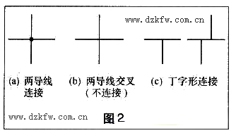 元器件之間的連接導線在電路圖中用實線表示。導線的連接與交叉如圖2所示,圖2(a)橫豎兩導線交點處畫有一圓點,表示兩導線連接在一起。圖2(b)兩導線交點處無圓點,表示兩導線交叉而不連接。導線的丁字形連接如圖2(c)所示。