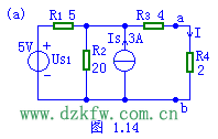 圖1.14(a)中,電路結構和參數已給定,應用戴維南定理求電流I=?(圖中電阻的單位為歐姆)。