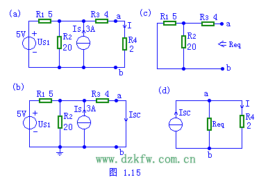分析:應用諾頓定理的關鍵是求出a,b兩端的短路電流Isc和入端電阻Req(或電導Geq),Isc等于ab兩端將負載短路時的電流如圖(b)所示;Req(或電導Geq)等于將ab左邊的含源二端網絡變為無源二端網絡時的入端電阻(或電導), 其等效電路如 (c)所示;最后利用圖(d)求得待求量。