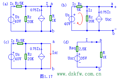 圖1.17(a)中,參數已給定,求R中的電流I=?分析:該電路中含有CCCS,解題思路與上一題類似,為了求開路電壓Uoc仍須將ab支路斷開如圖(b)所示,用任意方法求開路電壓。本題用網孔電流法,網孔電流如(b)紅線所示。在含有受控源的電路中,求入端電阻除了采用除獨立源加壓求電流外,還可以用開路電壓除以短路電流,即Req=Uoc/ISC求入端電阻。首先將負載短路,如(c),其中短路電流ISC,可用任意方法求短路電流ISC。最后得到戴維南等效電路(d),即可求I。
