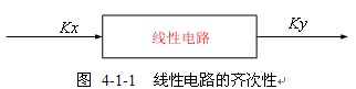 【齊次性】 在僅有一個獨立電源激勵的線性電路中,若將激勵增大K倍,響應也相應增大K倍,如圖4-1-1所示,如果