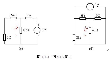 【例4-1-2】 應用疊加定理計算圖4-1-4(a)所示電路中的電壓u。并確定40Ω電阻消耗的功率。