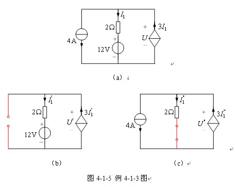 解 本例最簡單分析方法應該是結點法,為了說明受控電源在疊加定理應用時的處理方法,在此用疊加定理分析。用疊加定理分析含受控電源電路時,受控電源保留在獨立電源單獨作用的各電路之中。電壓源和電流源分別單獨作用的電路如圖4-1-5(b)和(c)所示。