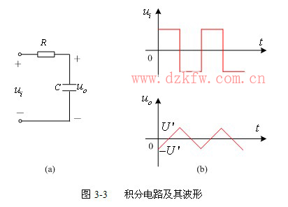 的積分成比例,故稱電路為積分電路,輸出端的波形如圖3-3(b) 所示。積分電路將輸入的方波轉換成了三角波。