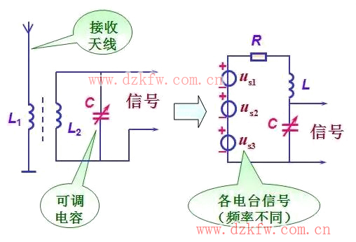 在收音機中,常利用串聯諧振電路來選擇電臺信號,這個過程叫做調諧,下圖即為其典型電路。