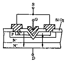 眾所周知,傳統的MOS場效應管的柵極、源極和漏極大大致處于同一水平面的芯片上,其工作電流基本上是沿水平方向流動。VMOS管則不同,從左下圖上可以看出其兩大結構特點:第一,金屬柵極采用V型槽結構;第二,具有垂直導電性。由于漏極是從芯片的背面引出,所以ID不是沿芯片水平流動,而是自重摻雜N+區(源極S)出發,經過P溝道流入輕摻雜N-漂移區,最后垂直向下到達漏極D。電流方向如圖中箭頭所示,因為流通截面積增大,所以能通過大電流。由于在柵極與芯片之間有二氧化硅絕緣層,因此它仍屬于絕緣柵型MOS場效應管。