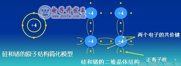 (2)N型半導體:在硅(或鍺)的晶體內摻入少量的雜質,如磷(或砷、銻)等,就構成了N型半導體。摻入五價元素,形成一個自由電子。N型半導體中的電子成為多數載流子——多子,而空穴為少子。