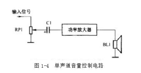 單聲道音量控制器是各種音量控制器的基礎,圖1-4是單聯電位器構成的的單聲道音量控制電路,它實際上是一個電阻分壓電路,電位器RP1相當于兩個分壓電阻。