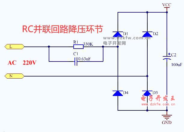 因此在電子電路中,這種由電阻R和電容C組成的電路稱為阻容電路,也叫RC并聯電路。這種形式的電路可以用在直流電路中,也可以用在交流電路中;可以用在弱電電子電路中,也可以用在強電電路中,比如我在維修養生壺、LED燈電源電路中就會碰到這種RC并聯回路環節,它們在電路中主要起到降壓作用,如下圖所示是一個阻容降壓電路。