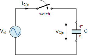 當交流正弦電壓施加到交流電容器的極板上時,電容器首先在一個方向充電,然后在相反方向充電改變極性以與交流電源電壓相同的速率。電容器兩端的電壓瞬時變化與以下事實相反:將電荷沉積(或釋放)到板上需要一定的時間,并且由 V = Q / C 給出。考慮下面的電路。