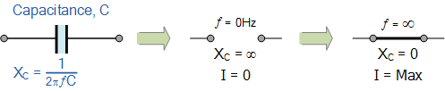 從上面的公式中我們可以看出容性電抗的值和因此,當頻率增加時,其整體阻抗(以歐姆為單位)向零減小,就像短路一樣。同樣,當頻率接近零或直流時,電容電抗增加到無窮大,就像開路一樣,這就是電容阻斷直流的原因。