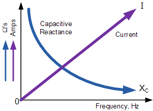 容性電抗與頻率之間的關系與電容電抗和頻率完全相反。感應電抗,( X L )我們在上一個教程中看到過。這意味著容性電抗“與頻率成反比”并且在低頻時具有高值,在較高頻率時具有低值,如圖所示。