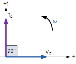 這種效應也可以用相量圖表示,其中在純電容電路中,電壓“LAGS”電流為90 o 。但是,通過使用電壓作為參考,我們也可以說電流“LEADS”電壓是一個周期的四分之一或90 o ,如下面的矢量圖所示。