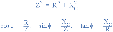 電流和電壓之間的相角由上面的阻抗三角形計算得出: