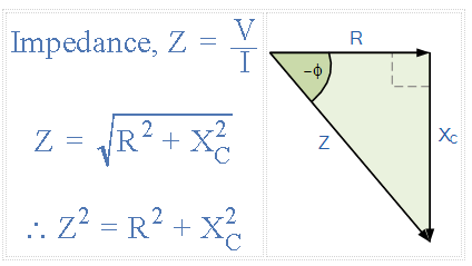 然而當電阻器和電容器在同一電路中連接在一起,總阻抗的相位角介于0 o 和90 o 之間,具體取決于所用元件的值。然后通過使用阻抗三角形可以找到上面所示的簡單RC電路的阻抗。
