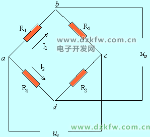 如圖1,電阻R1,R2,R3,R4作為四個橋臂,在a、c兩端接入直流電源ui,在b、d兩端輸出電壓u0。電橋的平衡條件:R1 * R3 = R2 * R4。