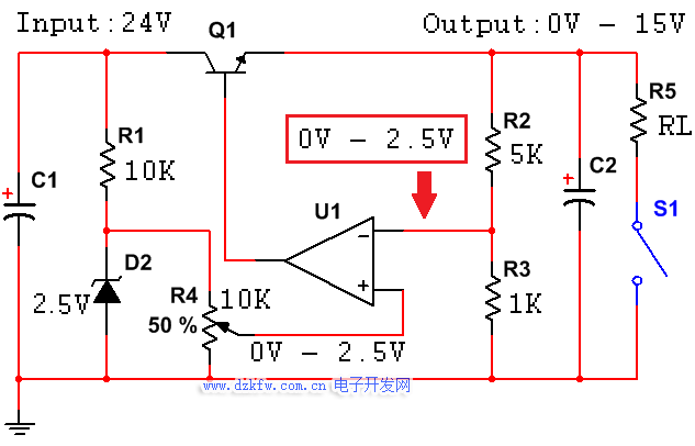 解釋:電路輸入為24V直流電源,經過C1濾波,經R1、D2穩壓管進行穩壓,穩壓在2.5V,同時在穩壓管兩端并聯一只10K的可調變阻器,可調范圍為:0V - 2.5V,又如圖所示,運放的同相端接在滑動變阻器的抽頭上,所以,同相端的電壓變化范圍也為:0V - 2.5V,運放的反向端接R2與R3分壓中間,故在R3的1K電阻上電壓變化范圍為:0V - 2.5V,那么在R2上電壓變化范圍為:0V - 12.5V,輸出電壓為R2+R3上的電壓總和,故為0V - 15V的變化范圍。
