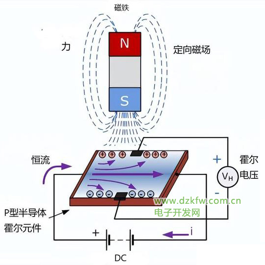 由于電荷載流子磁場的畸變,帶負電的電子將偏轉到板的一側,而帶正電的空穴將偏轉到板的另一側。在板的兩側之間會產生一個電位差,稱為霍爾電壓,可以用儀表測量。