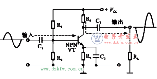 其中+vcc是電壓源;電阻器RJ和R2構(gòu)成一個分壓電路,通過分壓給基極(b)提供一個穩(wěn)定的偏壓i電阻器碼是榘電極電阻器,交流輸出信號經(jīng)電容器C3從負(fù)載電阻器上取得;電阻器。R4.是發(fā)射極(e)上的負(fù)反饋電阻器,用于穩(wěn)定放大器工作,該電阻值越大,整個放大器的放大倍數(shù)越小;電窖器C1是輸入耦合電容器;電容器C3是輸出耦臺電容器;與電阻器R4并聯(lián)的電容器C2是去耦合電容器,相當(dāng)于將發(fā)射極(c)交流短路,使交流信號無負(fù)反饋作用,從而獲得較大的交流放大倍數(shù)。