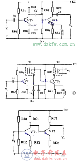 一個放大器通常有好幾級,級與級之間的聯系就稱為耦合。放大器的級間耦合方式有三種: ①RC 耦合,見圖 4 ( a )。優點是簡單、成本低。但性能不是最佳。 ② 變壓器耦合,見圖 4 ( b )。優點是阻抗匹配好、輸出功率和效率高,但變壓器制作比較麻煩。 ③ 直接耦合,見圖 4 ( c )。優點是頻帶寬,可作直流放大器使用,但前后級工作有牽制,穩定性差,設計制作較麻煩。